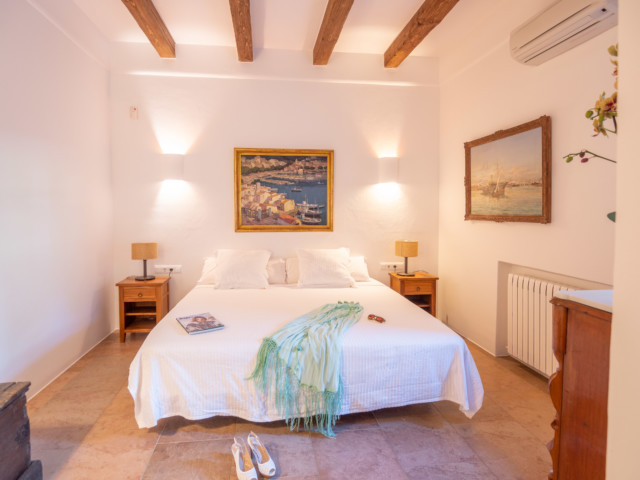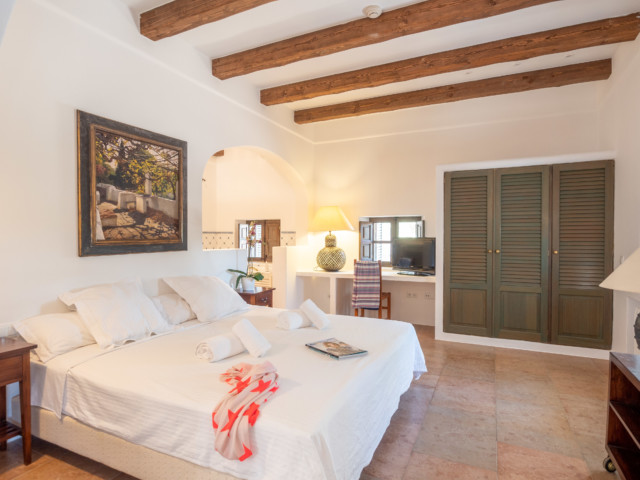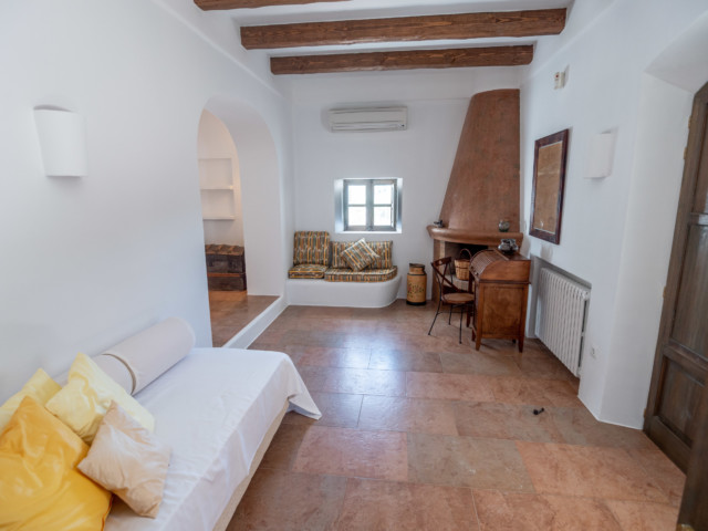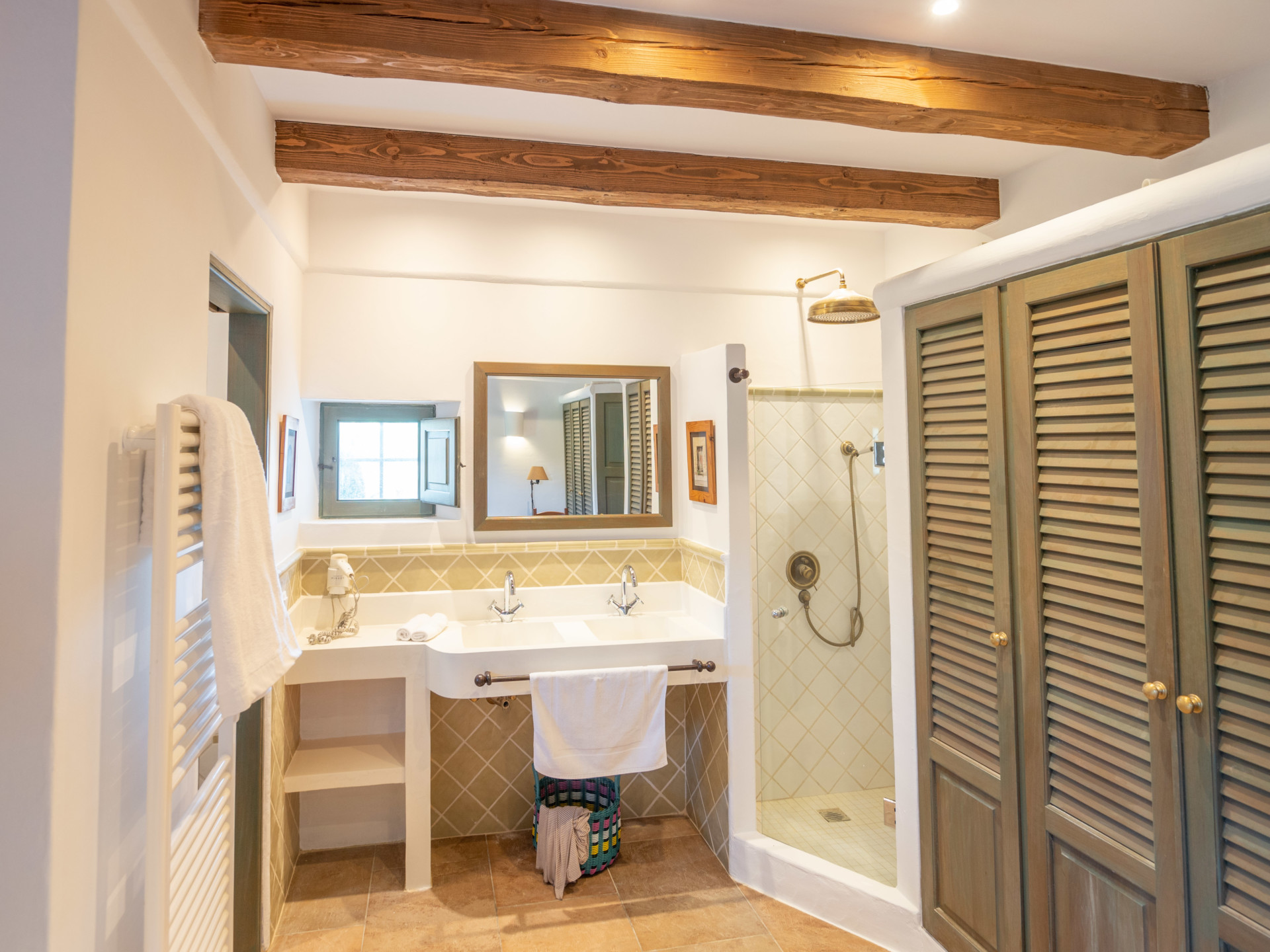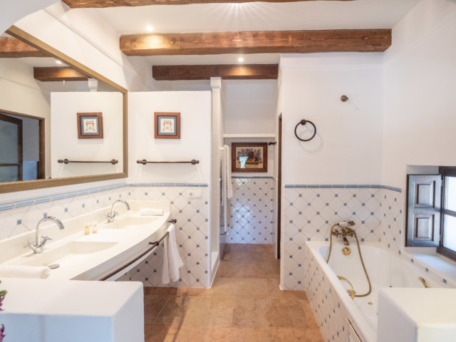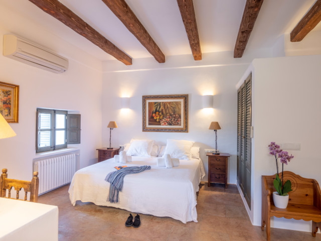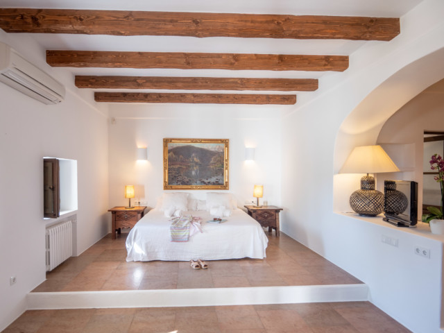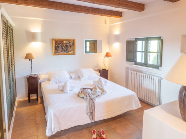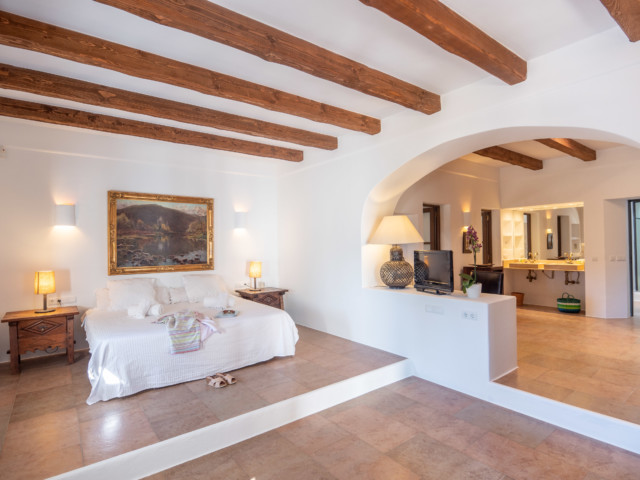 This is a wonderful newly renovated Ibizan villa set in extensive grounds with forest and terraces, with views across the countryside to Santa Eularia and the sea in the distance. Inside all the bedrooms are of the same standard, well furnished and with TV, raindrop showers and all the other comforts we expect. Outside there are several chill out or dining areas with a lovely overflow pool and jacuzzi to relax in. Ideal for a wedding or for a large group of families & friends.